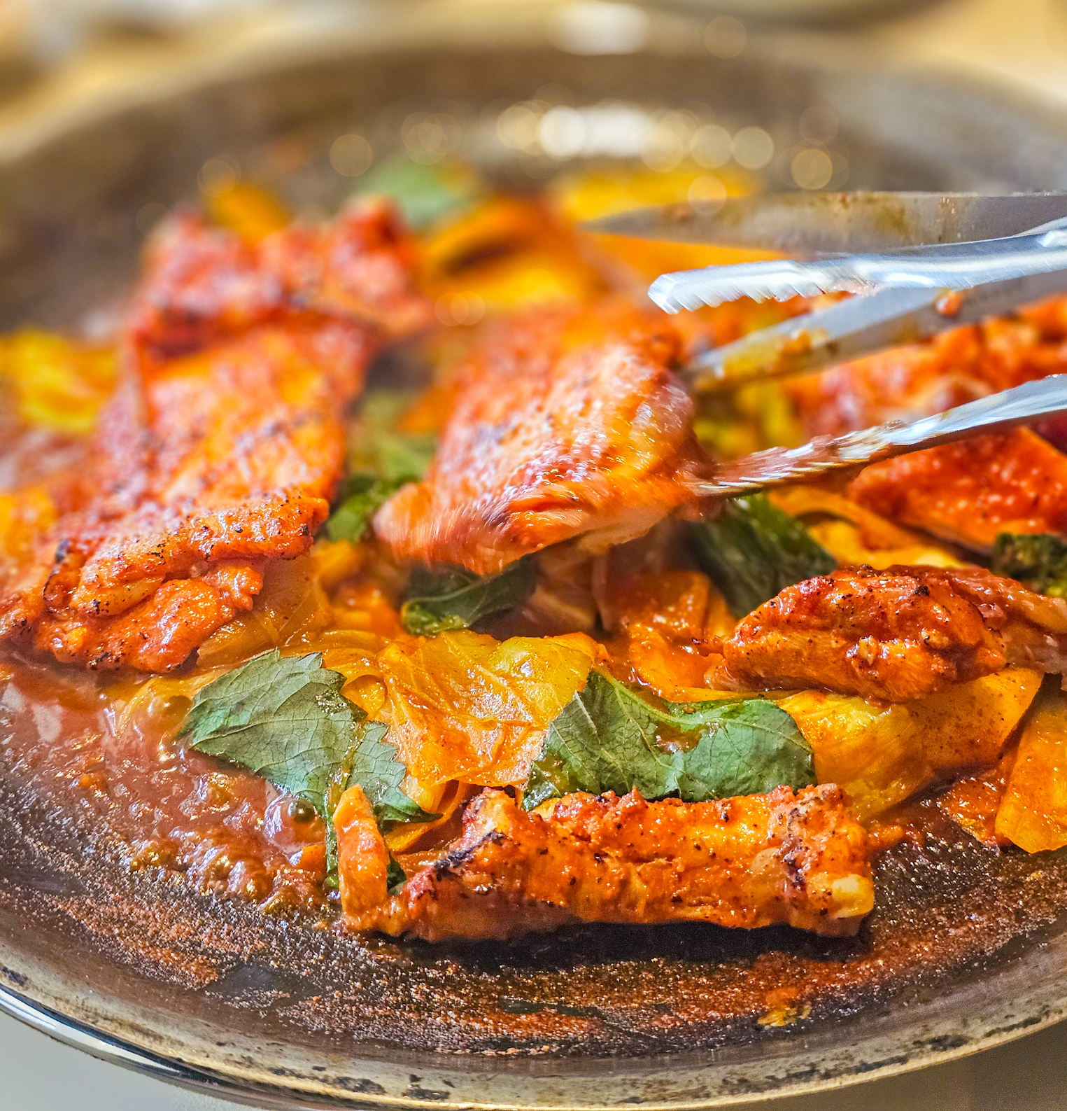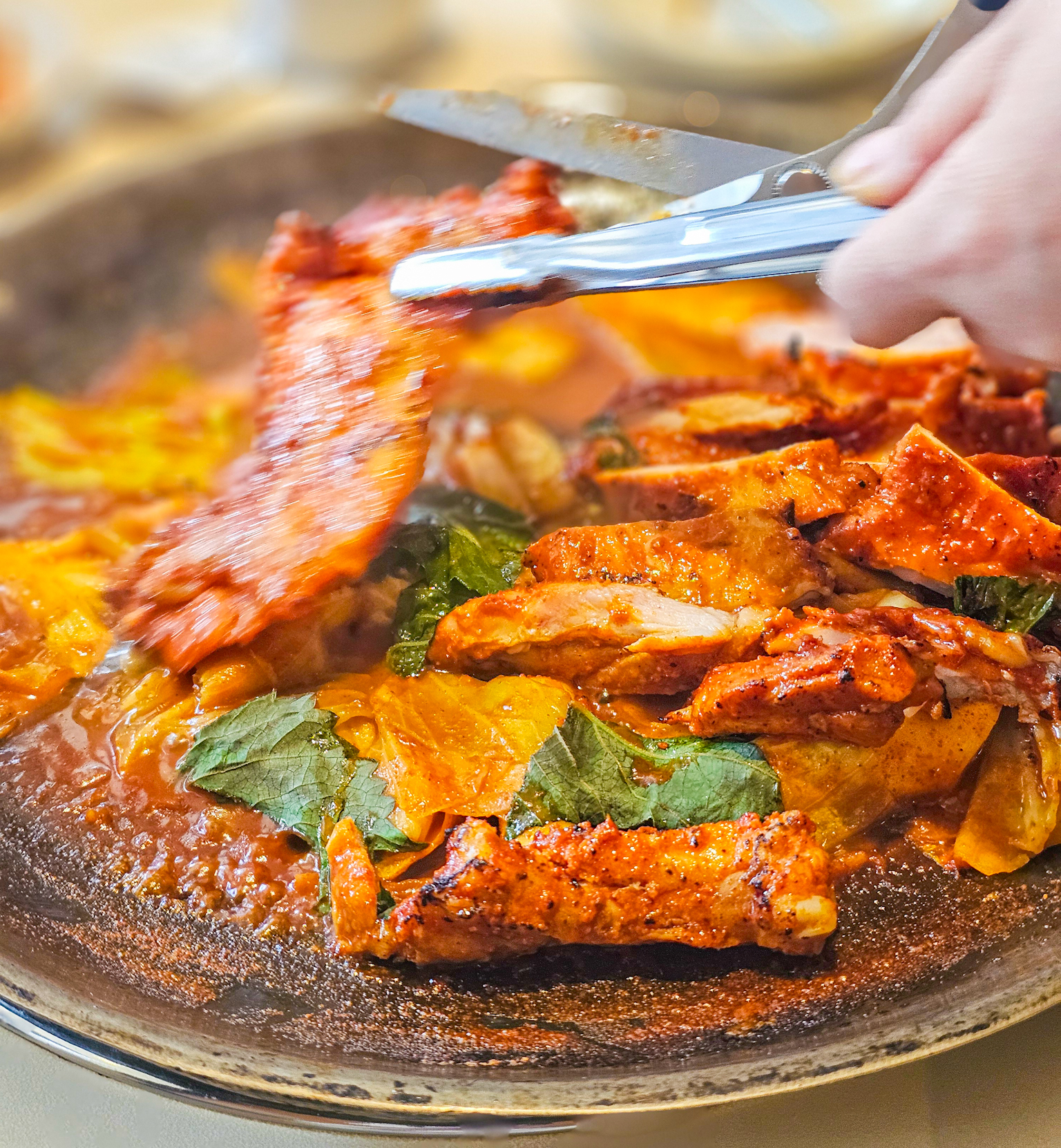 잠시 후, 커다란 철판 위에서 주황빛 양념을 입은 닭고기와 야채들이 치이익 소리를 내며 익기 시작했어요.