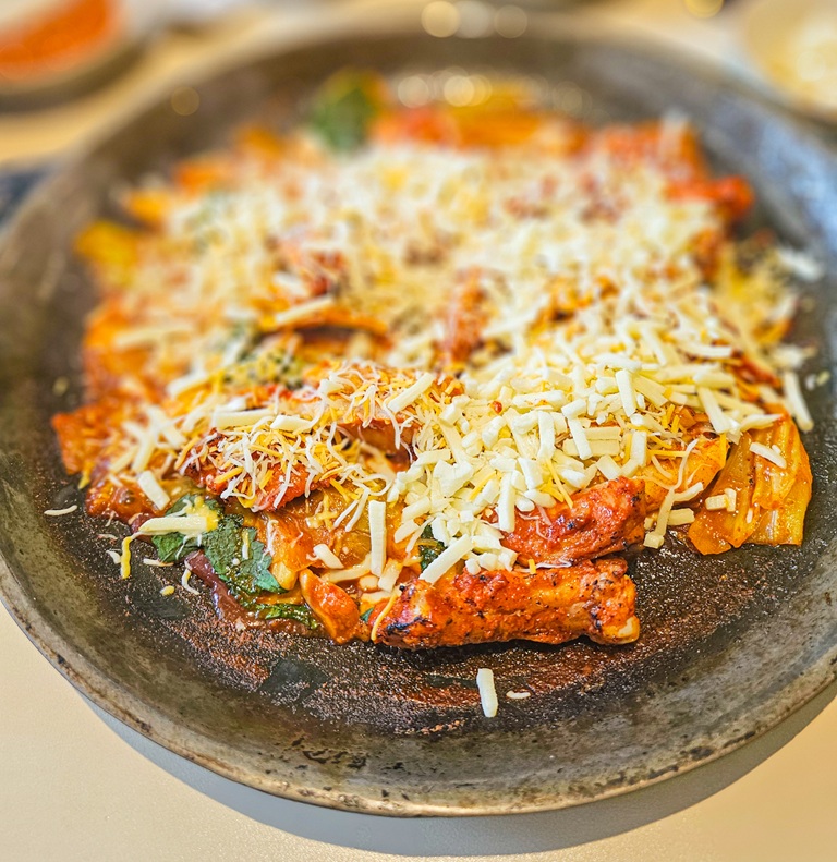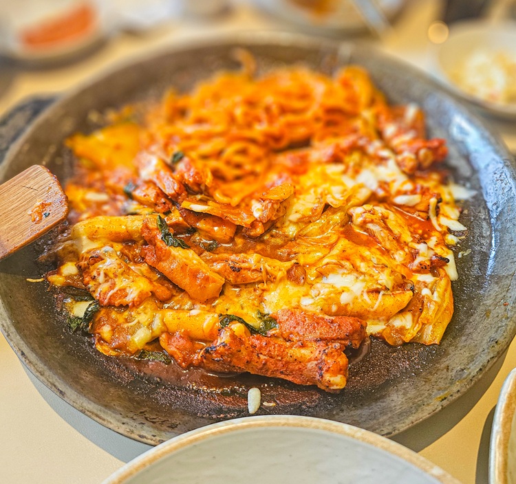 잘 익은 닭갈비를 쭉 늘어나는 치즈에 푹 찍어 먹으니, 고소함과 매콤함이 환상적인 조합을 이루더라고요.