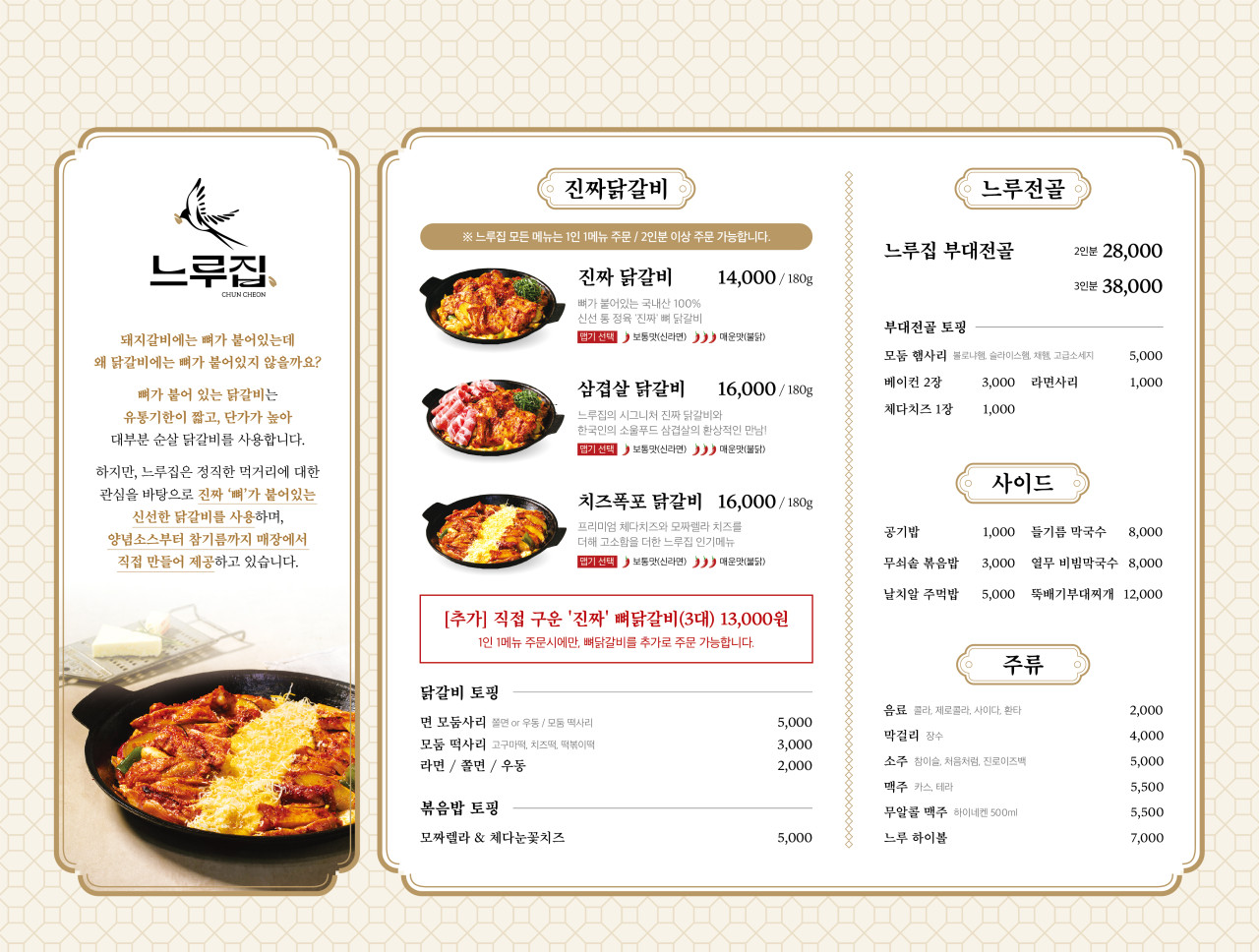 느루집은 진짜 닭갈비와 삼겹살 닭갈비, 치즈폭포 닭갈비 세 가지가 대표 메뉴였어요.